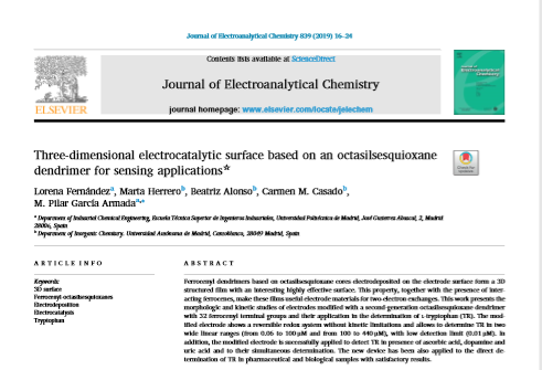 Los dendrímeros basados en núcleos de silsesquioxanos poliédricos pueden ser electrodepositados sobre la superficie de electrodos formando películas 3D con interesantes propiedades. Este trabajo presenta estudios morfológicos y cinéticos de electrodos modificados con un dendrímero de segunda generación con 32 grupos ferroceno terminales y su aplicación en la determinación de L-triptófano.